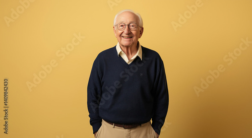 Um homem idoso, vestindo um cardigã azul-marinho e calças cáqui