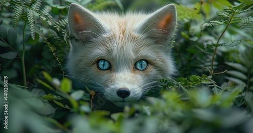 a magical Japanese white arctic fox hidden under a lush green tropical fern, warm thick jungle, Amazon, blue eyes, tiltshift, cinematic