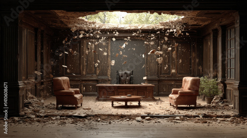 Surreal courtroom capturing chaos with floating laws and shattered gavels illustrating legal disorder and instability