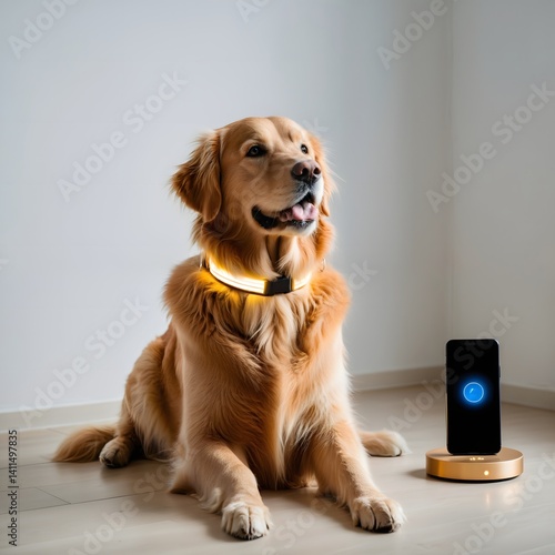 Smart Pet Technology - Golden Retriever Wearing LED Collar with Smartphone Control System Indoors