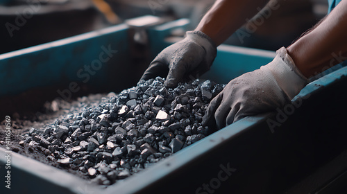 Laborer manually sorting lithium ore at a processing facility. Featuring manual sorting