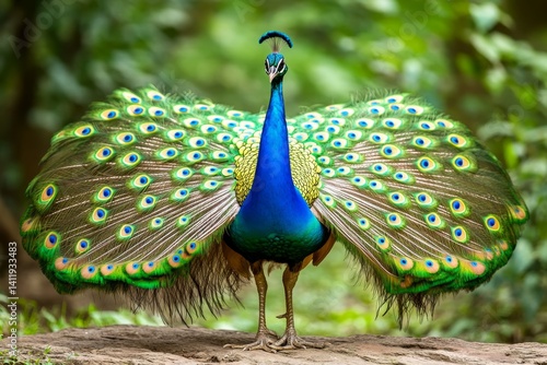 A male peacock (Galliformes) displaying its dazzling feathers in an extravagant courtship dance