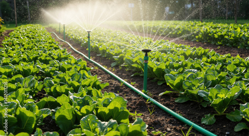Sprinkler system irrigating vegetable garden with leafy greens in rows. Automated watering system for efficient agriculture and crop cultivation