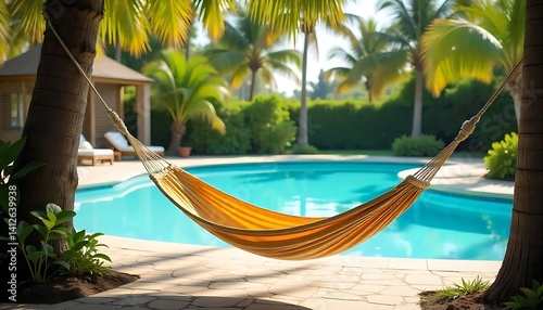 Hammock hanging between trees near the swimming pool, nobody. Summer vacation holiday travel resort relaxation outdoors, luxury poolside hotel deck, tropical villa garden, created with generative ai