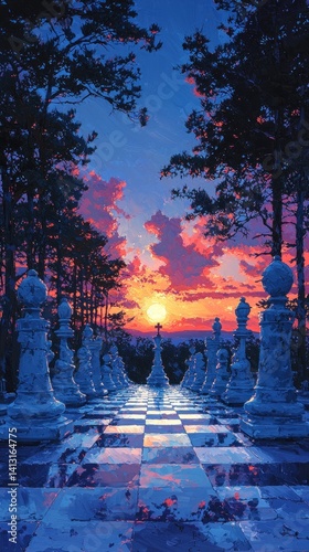 Surreal chess landscape with sunset, creating a captivating and strategic scene