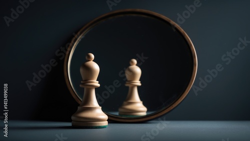 Pawn perceiving itself as a queen, chess piece reflected in a mirror. Self-evaluation, alter ego, genuine identity ideas