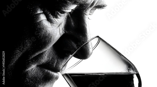 A mature man with intense focus intently smells a glass of rich red wine appreciating its aroma and depth.