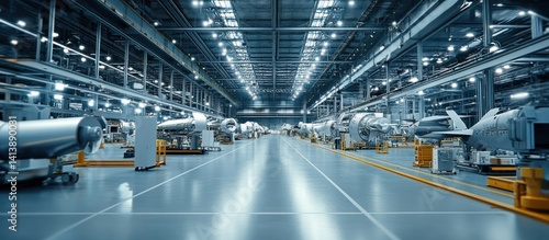 Modern aircraft manufacturing facility with advanced assembly lines under bright lights