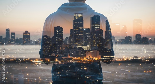 Person overlooking city skyline at twilight, creating a double exposure effect with the urban landscape and their own form.