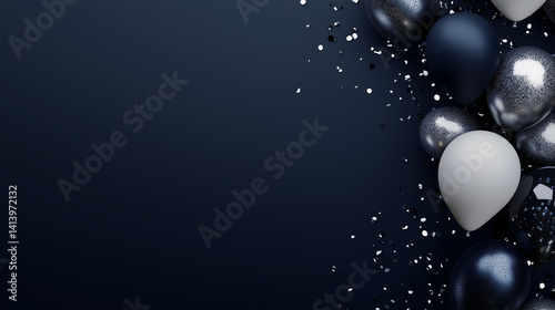 Birthday banner with masculine concept, dark gray to navy blue color gradation with shiny silver accents, minimalist balloon and confetti elements