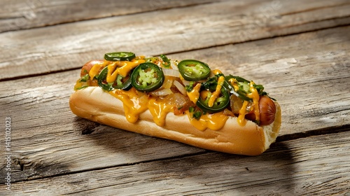Spicy Hot Dog with Jalapeños, Grilled Onion and Cheddar Cheese on Rustic Table