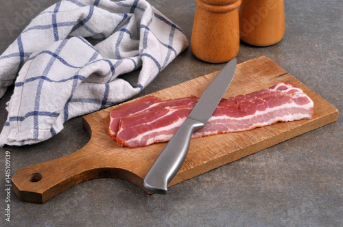 Tranches de poitrine fumée sur une planche à découper avec un couteau en gros plan