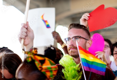 A diverse group of LGBTQ people at a pride parade. LGBTQ man with rainbow flag. LGBTQ man in pride parade, pride month celebration, LGBTQ man in pride parade, happy diverse people in pride parade