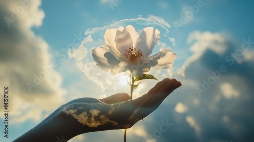 Double exposure of a hand holding a flower, petals blending into sky and clouds, poetic mood with text space