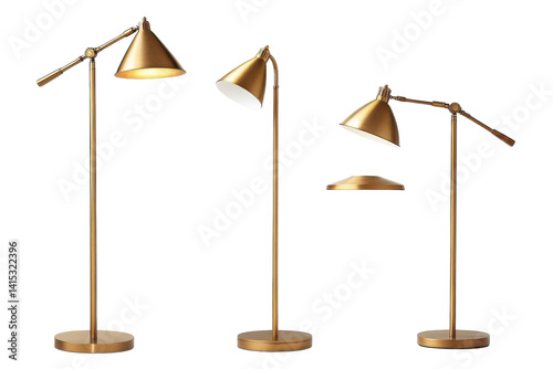 Elegant brass adjustable floor lamps perfect for modern interiors showcasing three styles with a sleek design against a black background on transparent background
