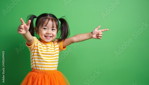 Happy little girl points both hands towards right side. Smiling child in striped yellow shirt, orange skirt against green background. Active kid cheerful face, fun school time, copy space available.