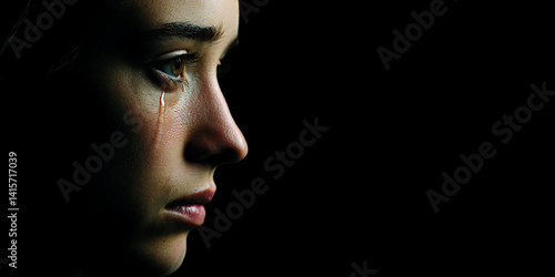 Close-up profile of young woman crying, tear rolling down cheek against black background, conveying sadness and emotional pain