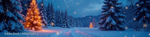 Snowy forest landscape with twinkling lights and Christmas trees, evergreen trees, festive atmosphere, snowy forest