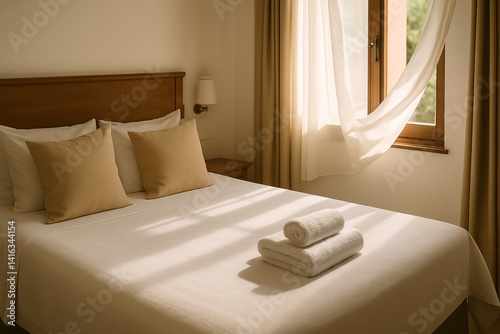 Quarto de hotel minimalista com cama arrumada e luz do sol entrando pela janela de madeira