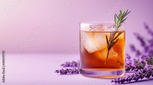 A glass of iced lavender tea with a sprig of rosemary on a pastel lavender background digital