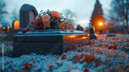 Frost-covered grave with flowers at dawn