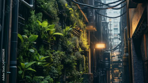 Szerokie Ujęcie Ukrytego Wertykalnego Ogrodu w Mrocznym Zaułku