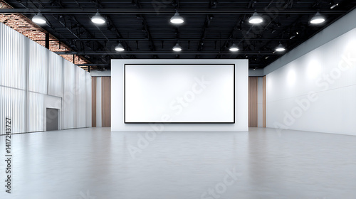 Empty modern exhibition hall with large blank screen clean floor bright lighting and symmetrical interior design symbolizing business event conference or presentation setup 10042025Shitax