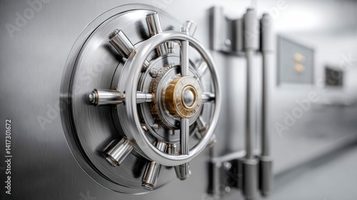 The heavy steel door of a bank vault, a symbol of wealth and financial safety is shown.