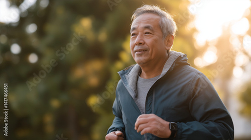 Elderly Asian man jogging in a misty park trail at dawn
