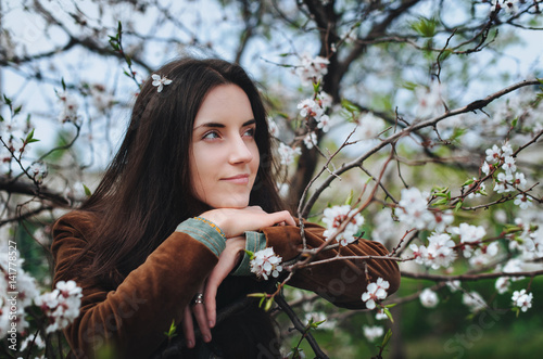Young beautiful girl near a blossom apricot tree. Spring dreams.
