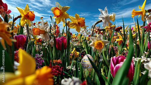 Panoramiczne Pole Wiosennych Kwiatów z Ukrytą Pisanką