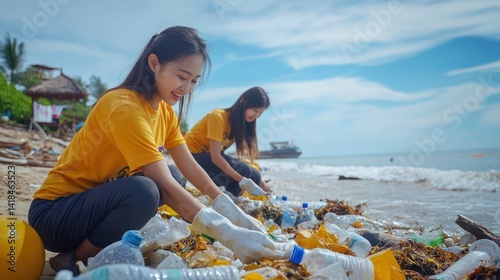 Dedicated young women diligently cleaning up plastic waste from the beach shores
