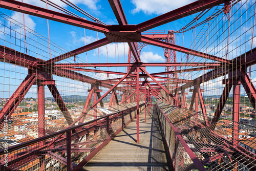 View along the top of the bridge. The Vizcaya Bridge, the worlds oldest transporter bridge, built in 1893, links the towns Portugalete and Las Arenas in the Basque Country, in the north of Spain