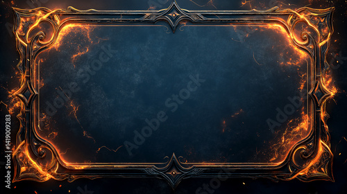 Ornate fantasy frame with glowing fiery edges on dark textured background, medieval magical UI overlay border design