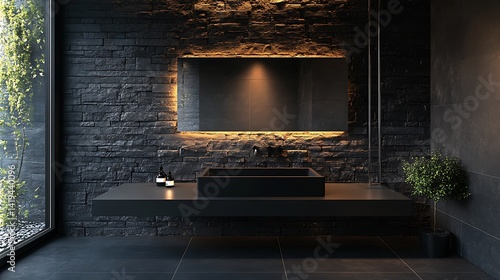Ultra-modern washroom with a rectangular matte black sink, chrome steel piping, and an LED backlit mirror, surrounded by dark stone tiles and minimalist wall textures.