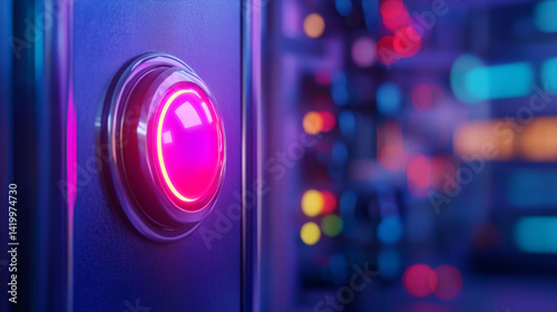 Close-Up of a Brightly Lit Emergency Stop Button in a Modern Control Panel with Colorful Background Lights