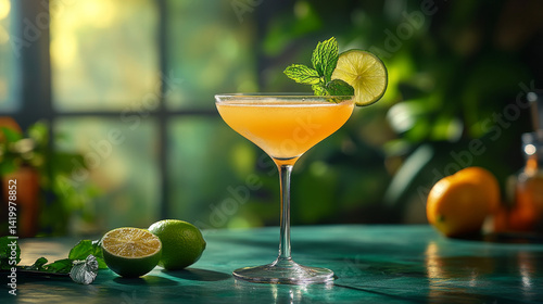 A summery cocktail adorned with lime and mint rests against a calming green background, radiating refreshment