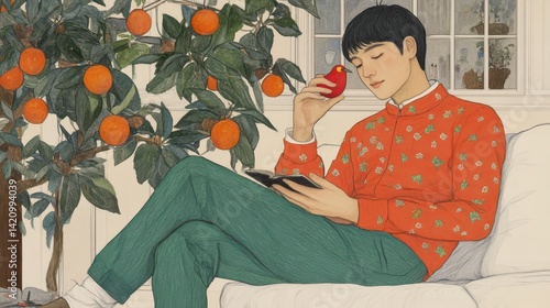 Tranquil reader with a bird oranges lounging on a sofa by a window