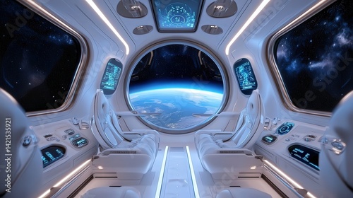 Futuristic spacecraft interior showcasing planet earth and the expansive cosmos