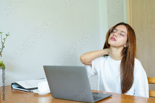 Asian teenage girl feeling neck pain while sitting at desk with laptop during remote workday at home showing tired facial expression in casual outfit with glasses and long hair
