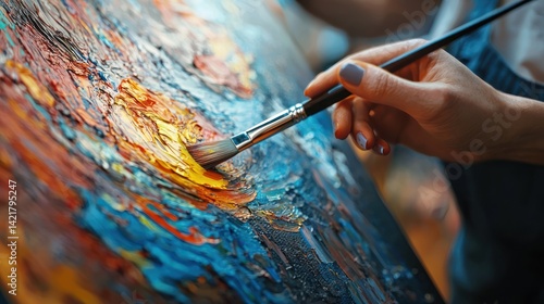 Artist painting vibrant oil canvas, studio setting. Possible use stock photo for art, creativity, skill, painting, and tutorials