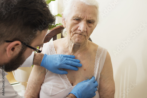 Lekarz geriatra podczas badania. Lekarz bada zmiany na skórze u starej kobiety.
