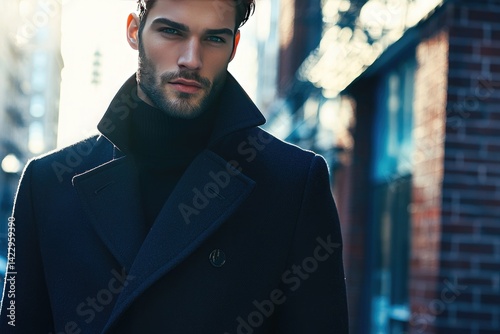 A handsome man in a black coat, with a city background and buildings with blue glass windows