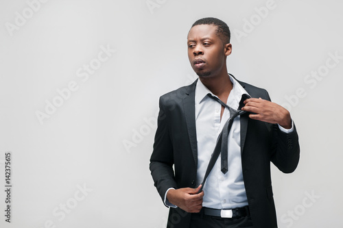 Afroamerican office employee. Tough work, hard breathing, problems, pressing staff, inability to rest. Grey background with free space.