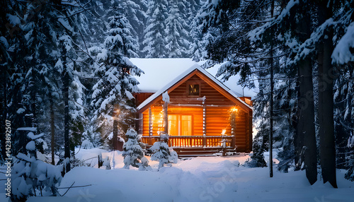 Winter Cabin in a Snowy Forest: Nestled amidst a serene winter landscape, a cozy wooden cabin exudes warmth and inviting light, offering a haven of comfort within a tranquil snow-covered forest.