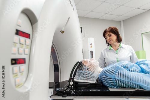 A young woman wearing an immobilization mask undergoes computed tomography before radiation therapy. Concepcion of diagnostics and therapy of cancer patients.