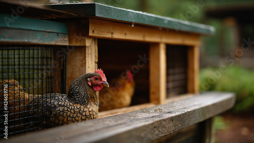 Rare chicken breeds in backyard coop, light rain with reflections on coop roof, soft moody feel