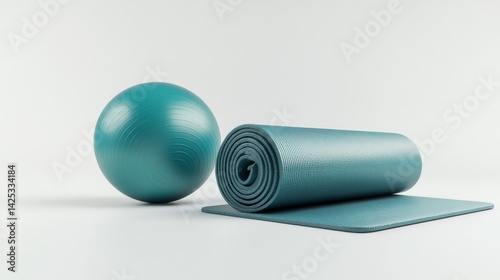 3d rendered pilates set featuring teal exercise ball and premium yoga mat, floating arrangement against white background, photorealistic textures showing material details, soft gradient shadows,