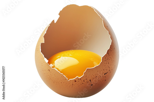 Close-up of cracked brown egg with yolk inside eggshell, isolated on white transparent background. Concept of Easter, food, fertility, and organic nutrition