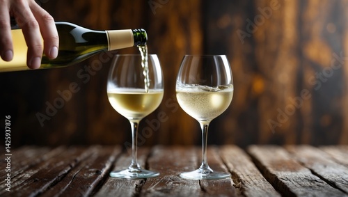 White wine glasses and bottle neck resting on wood with copy space for advertising or branding